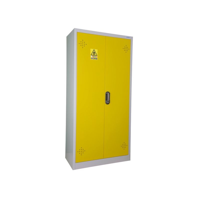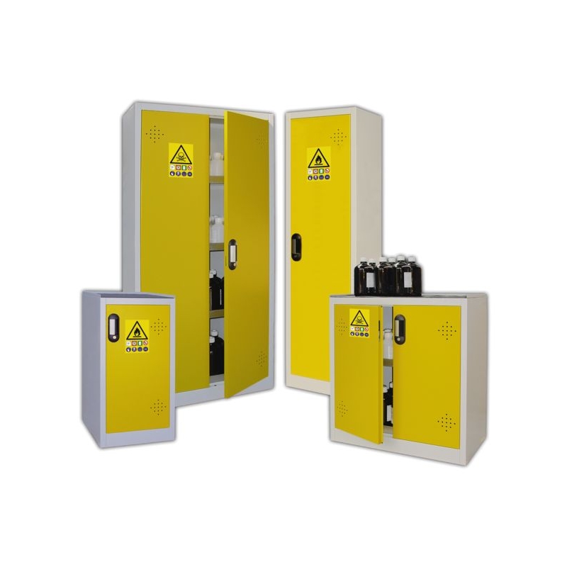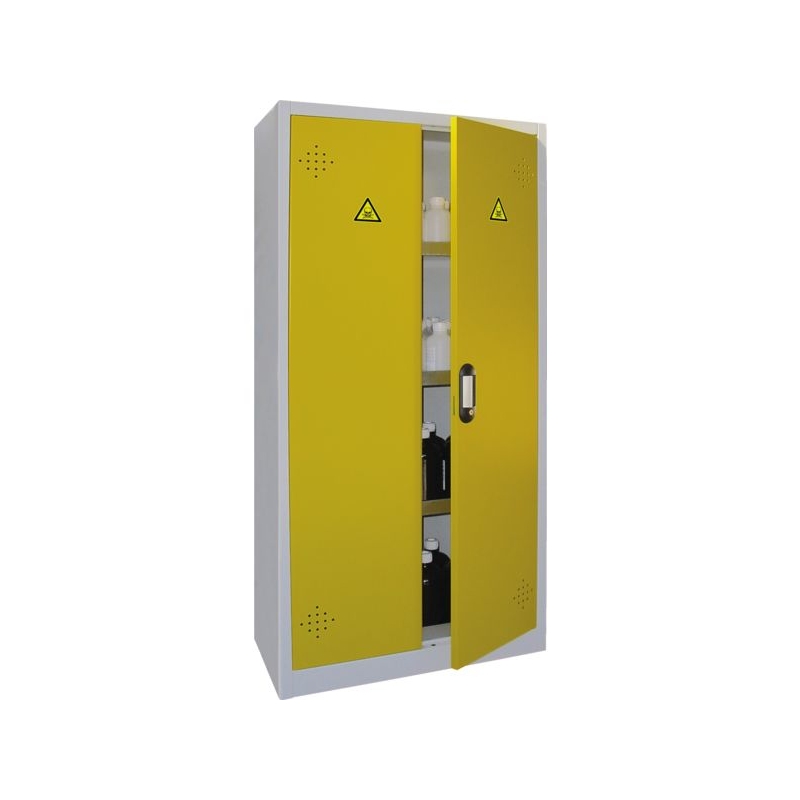 En acier monobloc avec portes battantes à 110°. Fournie avec pictogrammes normalisés. Orifices de ventilation. Fermeture à clé en 3 points. Étagères et bacs de rétention réglables en hauteur sur crémaillères, au pas de 15 mm. Armoire haute à 4 étagères ou basse à 2 étagères. Plan de travail des armoires comptoirs recouvert par un tapis en caoutchouc. Conforme aux articles R5132-66 et R5132-68 du Code de la Santé Publique. Conforme aux recommandations de l'INRS. Charge admissible par étagère : 80 kg UR Coloris : corps gris et portes jaunes Existe avec portes rouges, bleues ou vertes, nous consulter.