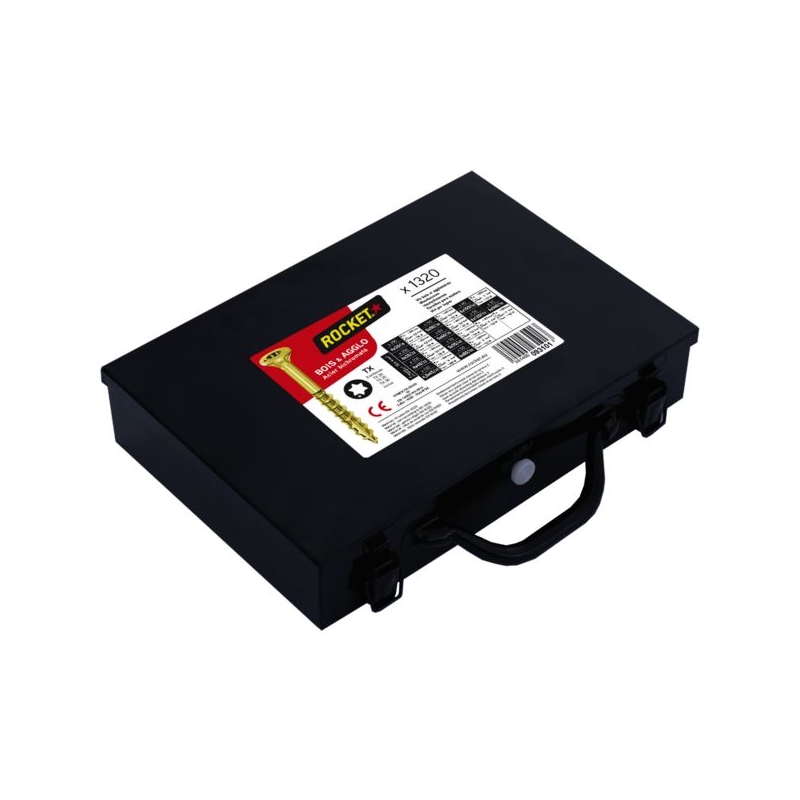 Tête fraisée, empreinte Torx pour le bois et l'aggloméré. Acier bichromaté. Filetage partiel. Composée de 1320 vis : - Ø 4 x 30/18 mm (290 pièces), - Ø 4 x 35/22 mm (250 pièces), - Ø 4 x 40/22 mm (200 pièces), - Ø 4,5 x 45/30 mm (130 pièces), - Ø 5 x 50/30 mm (110 pièces), - Ø 5 x 60/35 mm (80 pièces), - Ø 5 x 70/45 mm (70 pièces), - Ø 6 x 80/50 mm (50 pièces), - Ø 6 x 100/60 mm (40 pièces), - Ø 6 x 120/70 mm (50 pièces), - Ø 6 x 140/70 mm (50 pièces), - 3 embouts inclus.