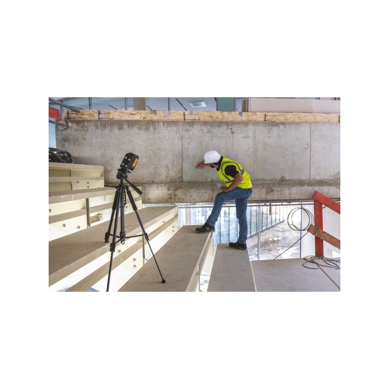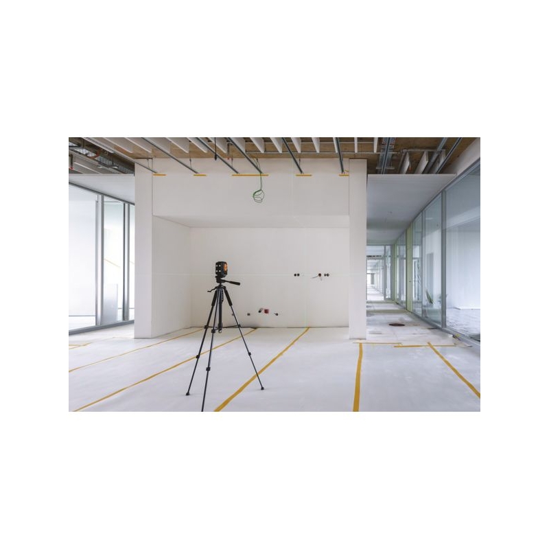 Laser à croix automatique, ligne verte. L'intersection des lasers forment une croix grâce à la ligne verticale grand angle ainsi qu'à la ligne horizontale très large. Possibilité de travailler automatiquement ou manuellement. Portée sans cellule : 20 m Portée avec cellule : 40 m Indice de protection : IP 54 Plage auto-nivellement : 3° Livré en sac avec trépied colonne, support mural et jeu de piles.