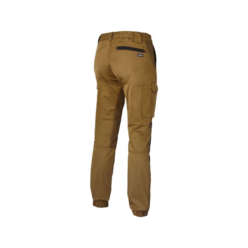 Sergé stretch bicolore 47% coton 35% polyester T400® 18% polyamide Cordura®, 260 g/m². Ceinture élastiquée fermée par 1 bouton plastique. Dos couvre-rein. Braguette avec fermeture à glissière. Bas de jambe élastiqué. Renforts genou en Cordura. Poches italiennes, 1 poche passepoilée zippée dos, 2 poches cuisse plaquées avec compartiment stylo + encoche stylo à gauche et compartiment mètre à droite. Accroche clefs insérée sous la ceinture devant droit. Entrejambe 82 cm Coloris : camel, marine, gris, noir Taille : 38 à 52 Entretien : lavage industriel Norme : CE Cat I - EN ISO 15797
