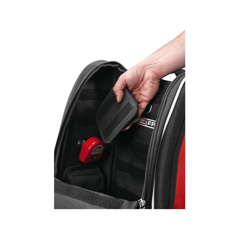 Permet de passer dans des espaces confinés. Compatible avec les échelles à crinoline. Fermetures à glissières cadenassables. Pochettes de rangement amovibles à positionnement libre grâce aux bandes de fixation (Velcro), avec élastique pour les outils. œillets extérieurs ovales pouvant porter jusqu'à 0,5 kg chacun. Bretelles matelassées, ergonomiques, poignée sur le dessus. Bandes réfléchissantes sur l'avant et les côtés. Charge maxi : 10 kg Dimensions : 300 x 180 x 480 mm Livré sans outils.