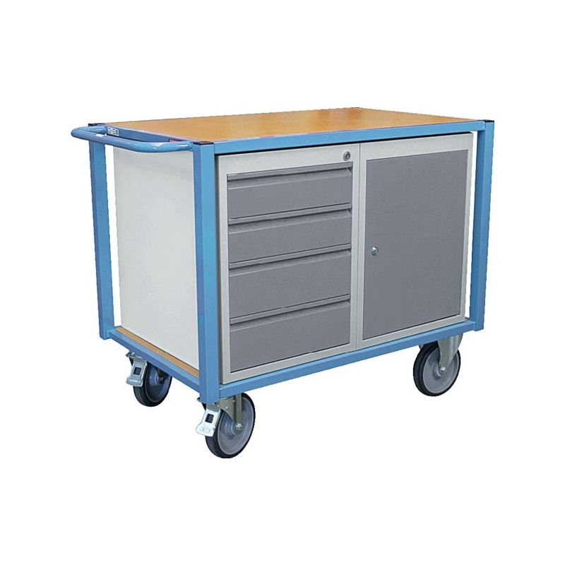 Arceau de poussée, plateau en médium de 16 mm d'épaisseur. Roues à bandage TPE Ø 200 mm, 2 fixes + 2 pivotantes à frein. Verrouillage des portes et des tiroirs à fermeture centralisée avec 1 jeu de 2 clés fourni. Capacité de charge : 500 kg Dim. plateaux bois : 1060 x 680 mm Dim. blocs : 470 x 625 x 620 mm Dim. hors-tout : 1185 x 680 x 930 mm Équipements : - 1 bloc porte équipé d'une étagère, - 1 bloc tiroirs (2 tiroirs hauteur 100 mm et 2 tiroirs hauteur 150 mm) Livrée montée.